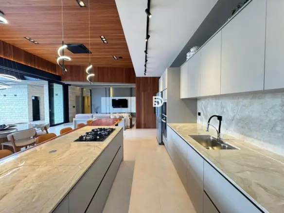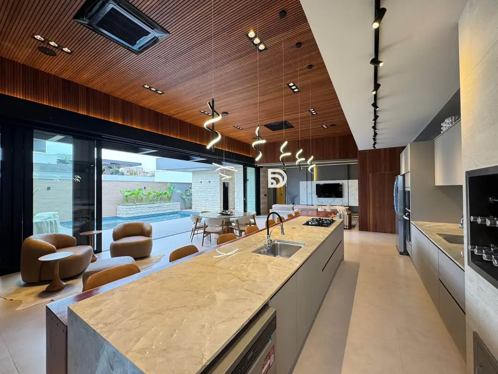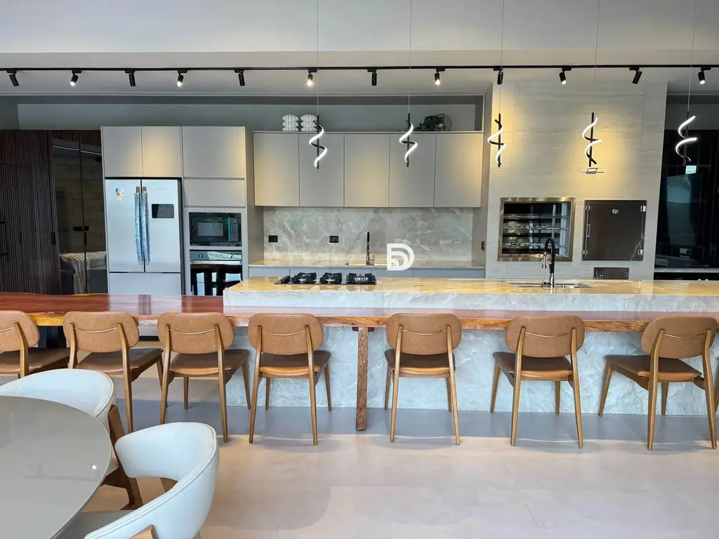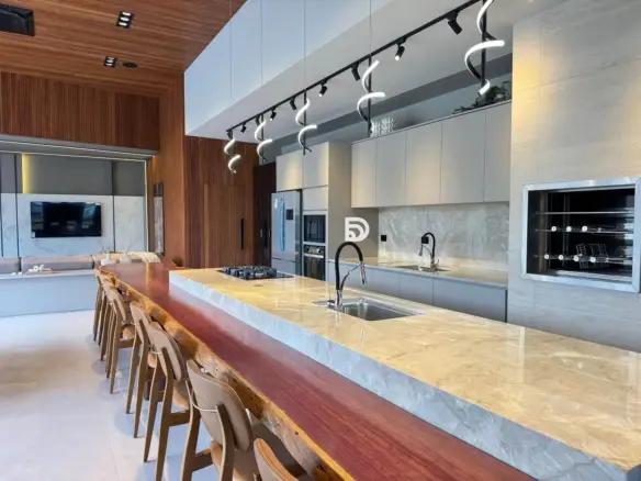 • Ampla área gourmet climatizada, integrada a todos os ambientes, ricamente decorada, equipada e automatizada, com: forno, micro-ondas, geladeira, cervejeira e cooktop.