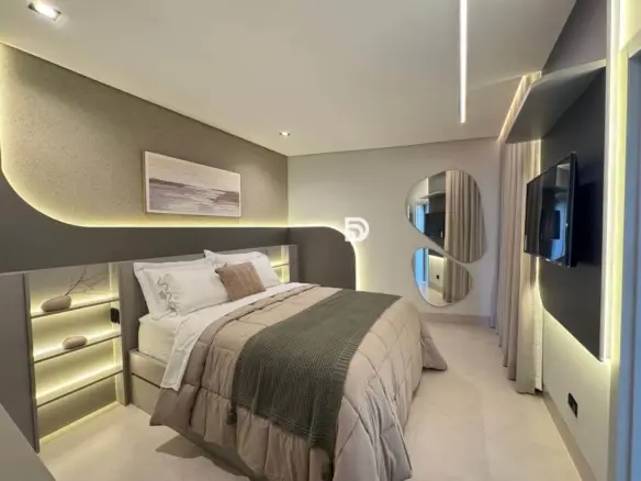 • 5 quartos, todos suítes, completos e equipados (camas, televisores, enxovais e janelas automatizadas).