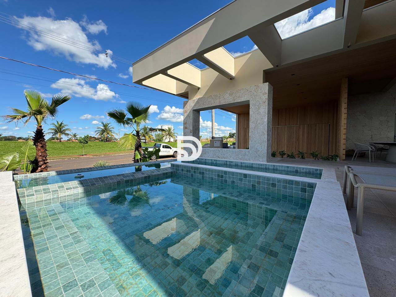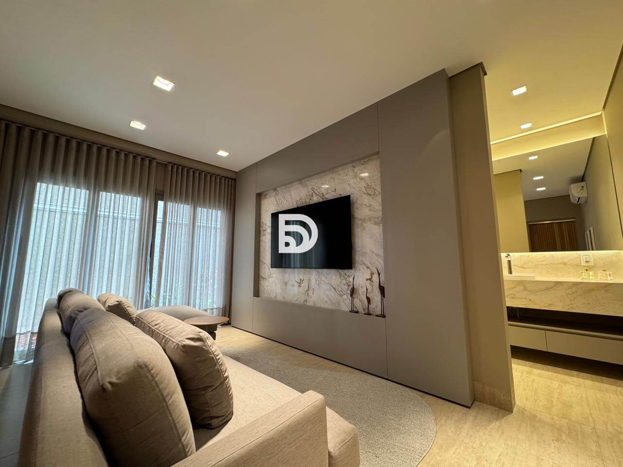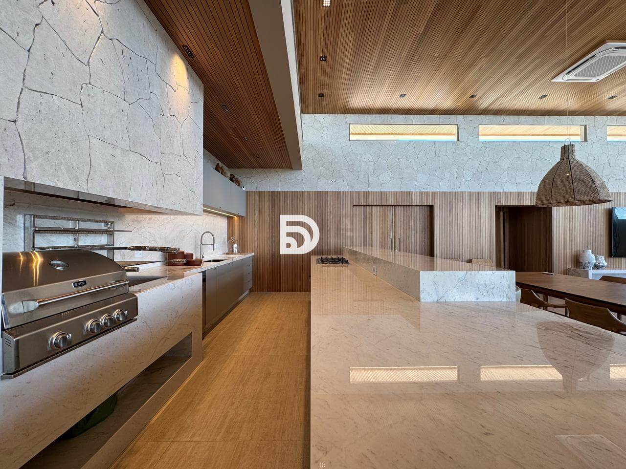 O imóvel é inteiramente revestido com a sofisticação atemporal da pedra Travertino. Nos detalhes internos, foi utilizado o mármore Michelangelo Premium.